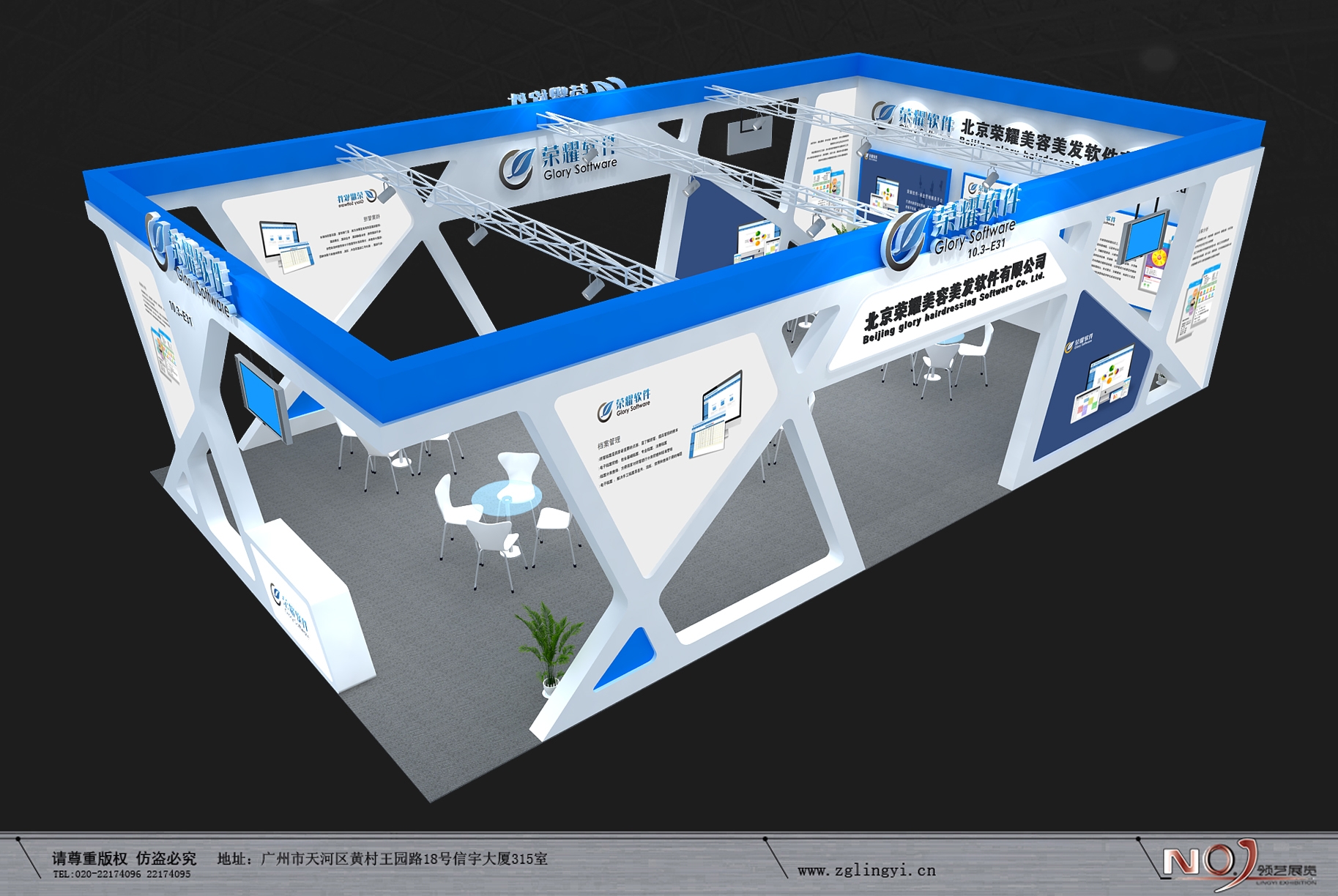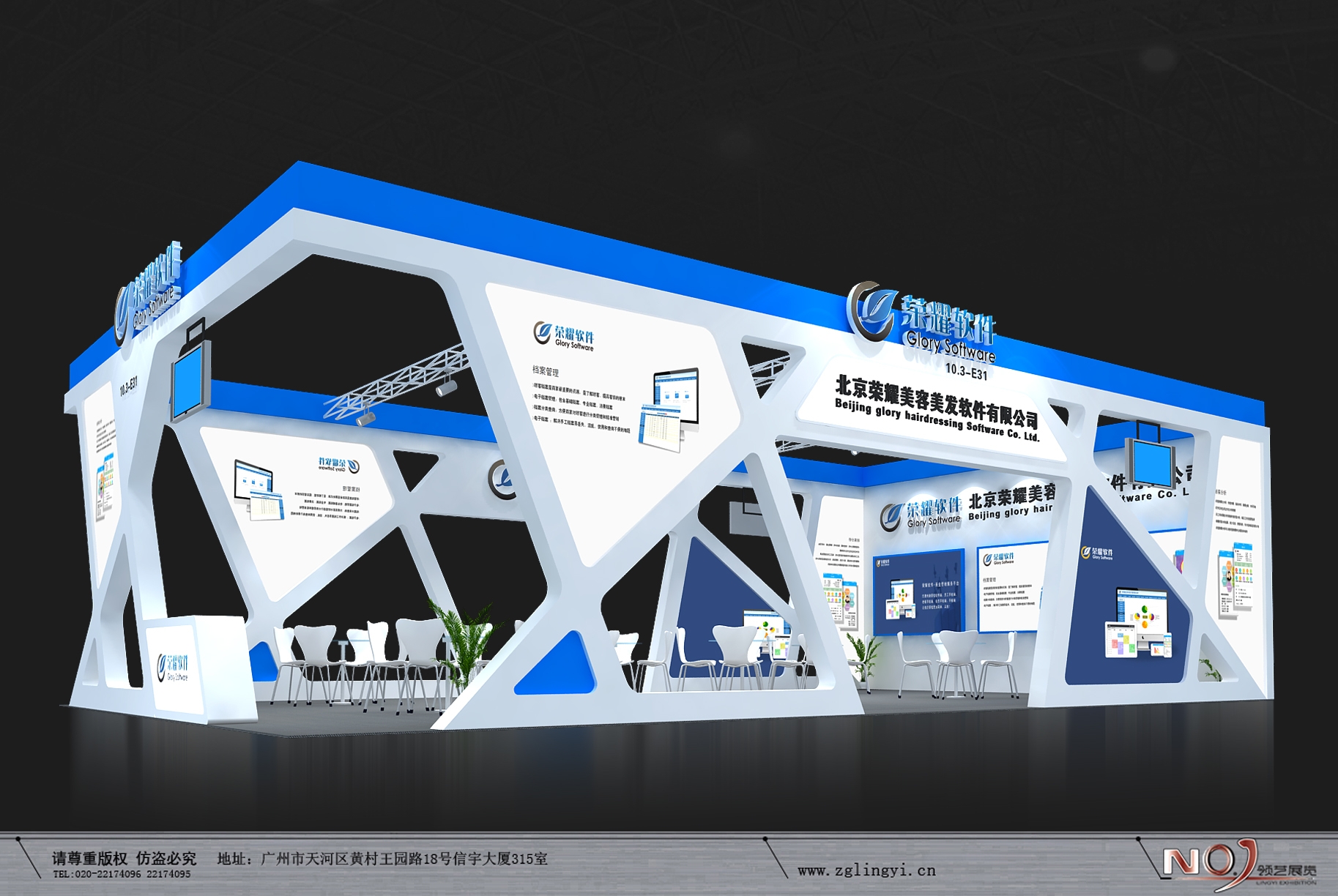 契合榮耀軟件的品牌形象和產(chǎn)品特性,采用線條,再搭配燈具燈光的效果,襯托出展位簡約、舒適的氛圍,突出一種現(xiàn)代、高端的時(shí)尚品味。
