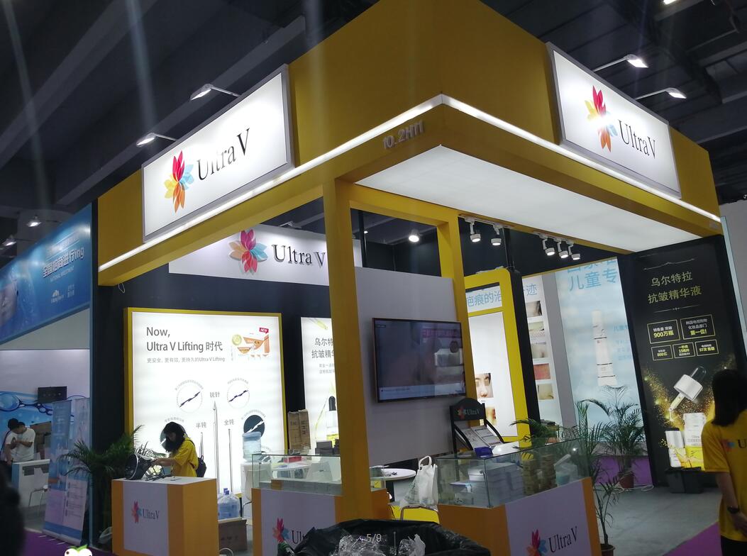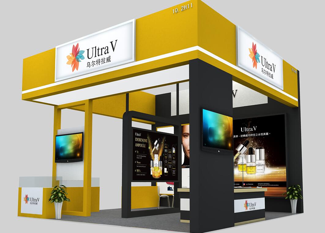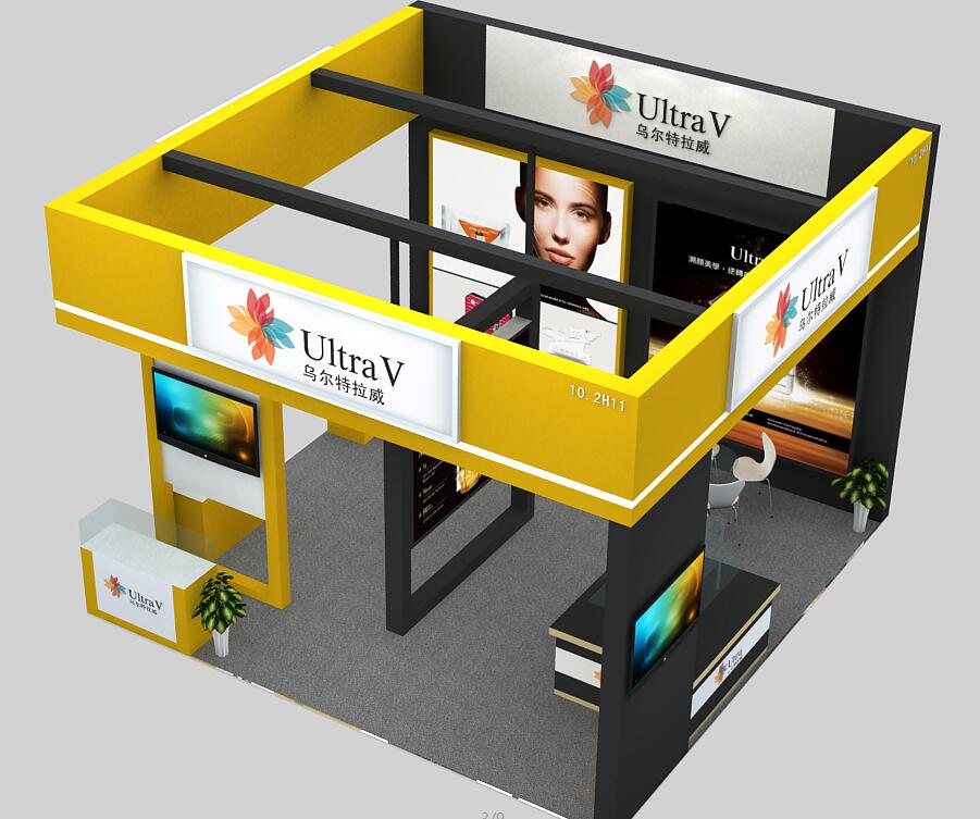 契合Ultra V的品牌形象和產品特性,采用弧型結構,再搭配燈具燈光的效果,襯托出展位大氣、豪華的氛圍,突出一種簡約、時尚的品味。