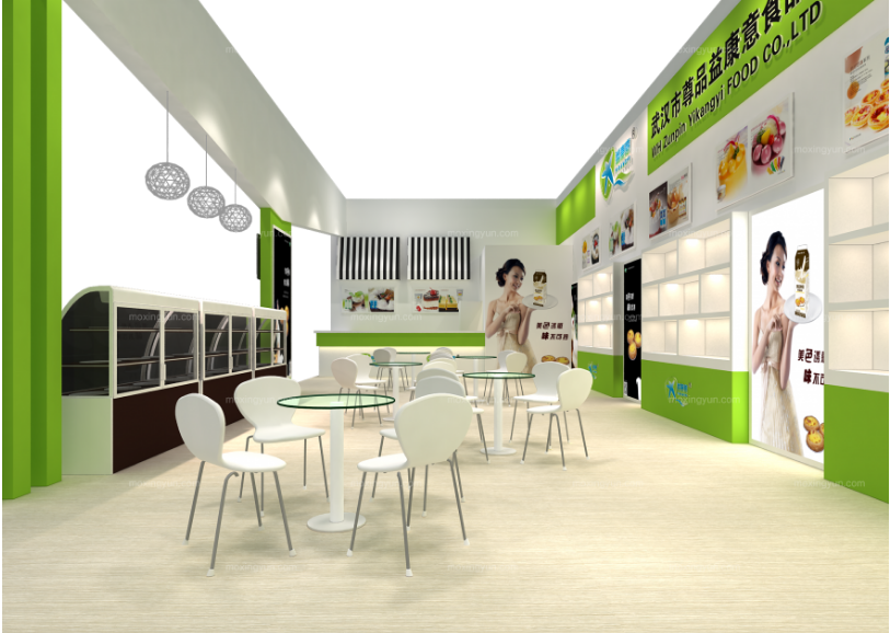 巧妙的運(yùn)用白色作主色調(diào)搭配綠色,著重突出品牌和產(chǎn)品的展示,使整個(gè)展位明亮又時(shí)尚。