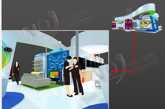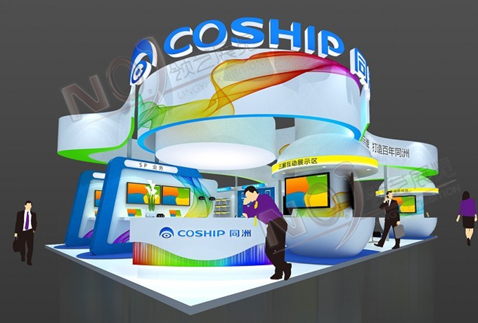 契合同洲電子的品牌形象和產(chǎn)品特性,采用曲線、框型結構,再搭配燈具燈光的效果,襯托出展位休閑、舒適的氛圍,突出一種躍動、簡約的時尚品味。