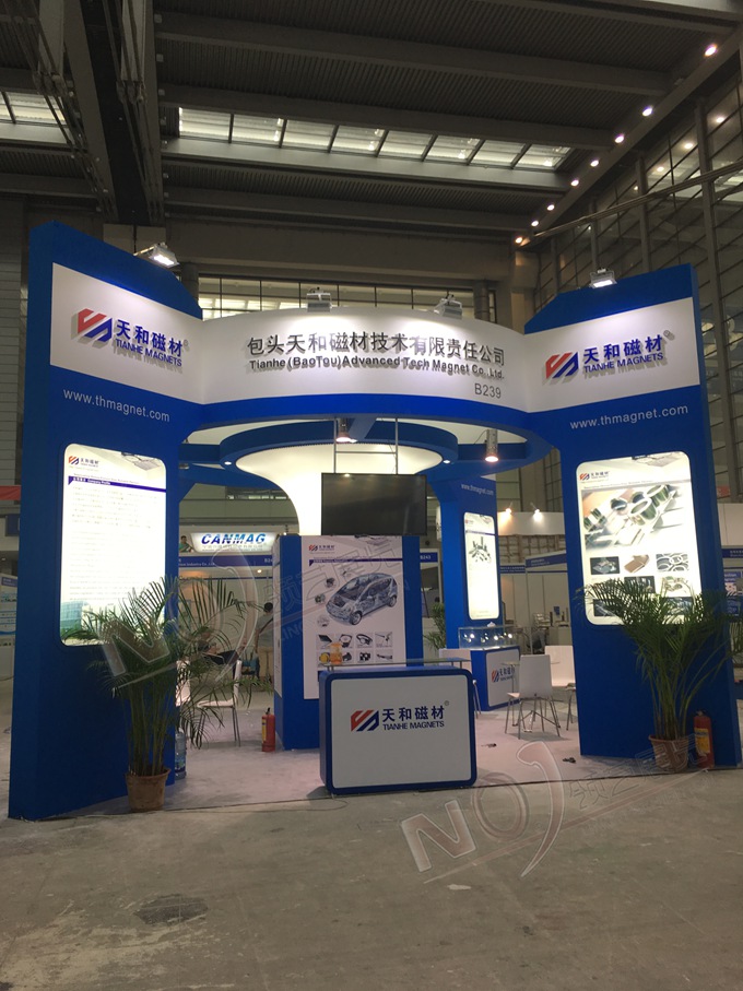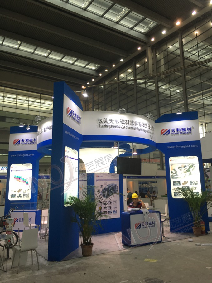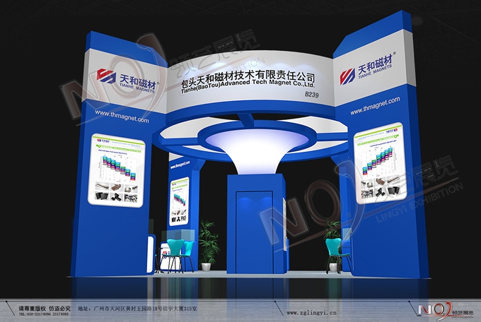 契合天和磁材的品牌形象和產(chǎn)品特性,采用曲線、框型結(jié)構(gòu),再搭配燈具燈光的效果,襯托出展位簡約、舒適的氛圍,突出一種躍動、簡約的時尚品味。