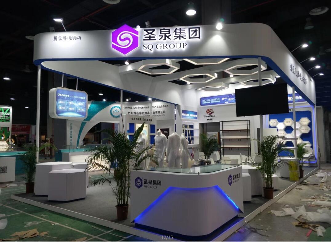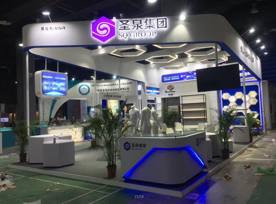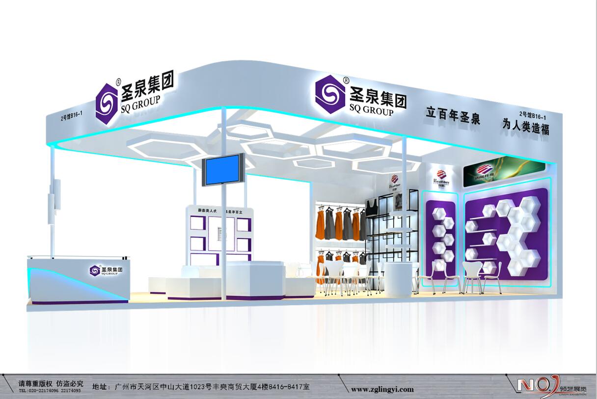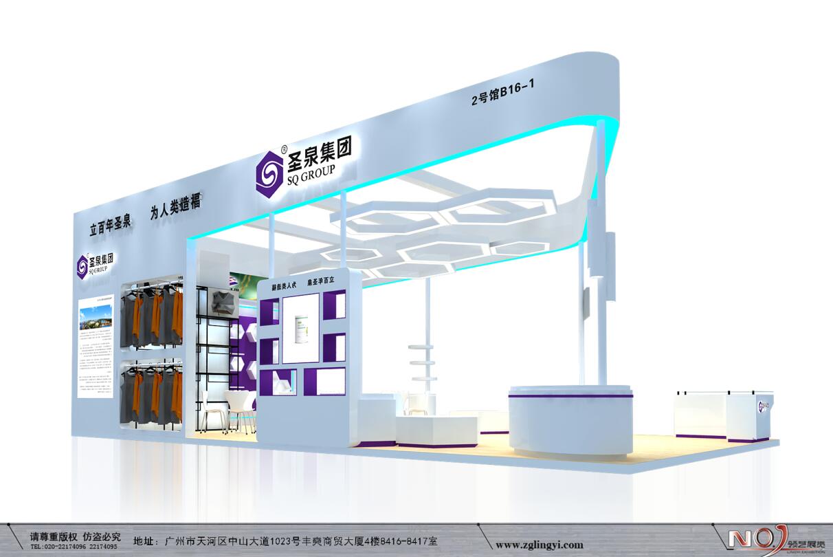 契合山東圣泉品牌形象和產(chǎn)品特性,利用天花造型,再搭配燈具燈光的效果,襯托出展位現(xiàn)代、突出一種現(xiàn)代、高端的時尚品味。