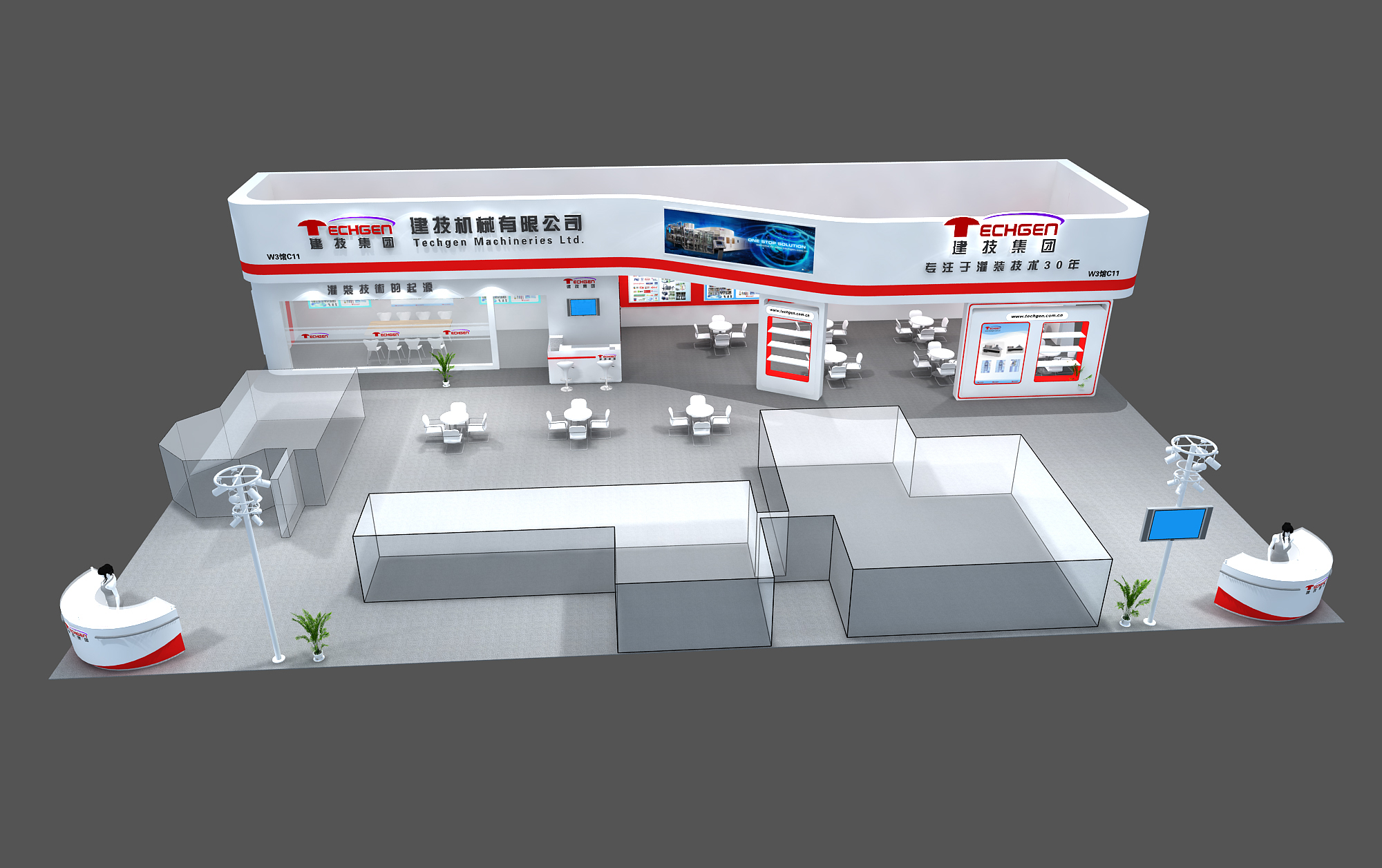契合建計集團的品牌形象和產品特性,采用矩形結構,再搭配燈具燈光的效果,襯托出展位簡約、舒適的氛圍,突出一種現(xiàn)代、高端的時尚品味。