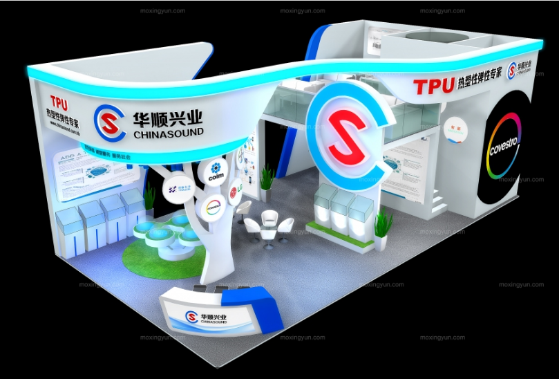 契合華順興業(yè)的品牌形象和產(chǎn)品特性,采用曲線、框型結(jié)構(gòu),再搭配燈具燈光的效果,襯托出展位簡(jiǎn)約、融合的氛圍,突出一種高端、舒適的時(shí)尚品味。