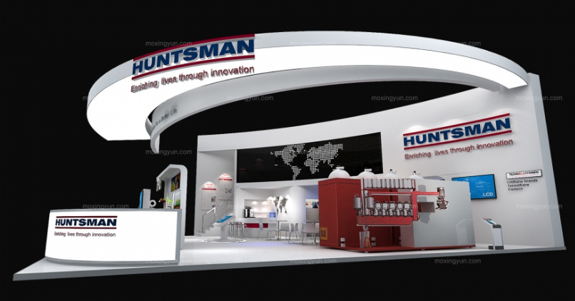 契合亨斯邁的品牌形象和產(chǎn)品特性,采用曲線、框型結(jié)構(gòu),再搭配燈具燈光的效果,襯托出展位簡(jiǎn)約、融合的氛圍,突出一種高端、舒適的時(shí)尚品味。