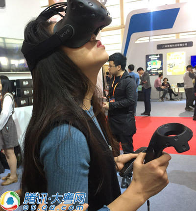 圖中女孩正在用HTC的VR設(shè)備,看敦煌莫高窟的360全景圖。該全景圖的設(shè)計(jì)公司是廣州思創(chuàng)之間,兩個(gè)手柄左邊是虛擬空間里的手電筒,右邊是“魔法棒”。