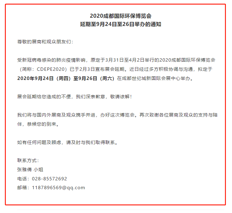 根據(jù)成都環(huán)博會設(shè)計搭建公司領(lǐng)藝展覽了解到,原定于3月31日至4月2日舉行的2020成都國際環(huán)保博覽會(簡稱:CDEPE2020)已于2月3日宣布展會延期。近日經(jīng)過多方積極協(xié)調(diào)與溝通,擬定于2020年9月24日(周四)至9月26日(周六)在成都世紀(jì)城新國際會展中心舉辦。如需環(huán)博會設(shè)計請聯(lián)系領(lǐng)藝展覽,希望我們能在環(huán)博會搭建上為您添磚加瓦,祝各位朋友收獲多多,滿載而歸!