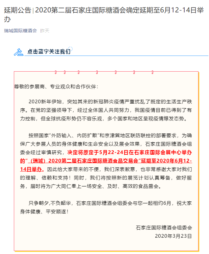 根據糖酒會設計搭建公司領藝展覽了解到,原定于5月22-24日在石家莊國際會展中心舉辦的“(瑞城)2020第二屆石家莊國際糖酒食品交易會”延期至2020年6月12-14日舉辦。如需糖酒會設計請聯系領藝展覽,希望我們能在糖酒會搭建上為您添磚加瓦,祝各位朋友收獲多多,滿載而歸!