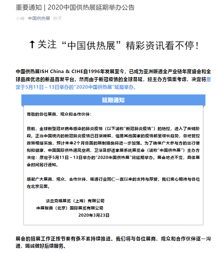 根據(jù)供熱展設(shè)計搭建公司領(lǐng)藝展覽了解到,中國供熱展ISH China & CIHE自1996年發(fā)展至今,已成為亞洲暖通全產(chǎn)業(yè)鏈年度盛會和全球品牌優(yōu)選的新品首發(fā)平臺。然而由于新冠疫情的全球蔓延,經(jīng)主辦方慎重考慮,決定將原定于5月11日~13日舉辦的“2020中國供熱展”延期舉辦。如需供熱展設(shè)計請聯(lián)系領(lǐng)藝展覽,希望我們能在供熱展搭建上為您添磚加瓦,祝各位朋友收獲多多,滿載而歸!