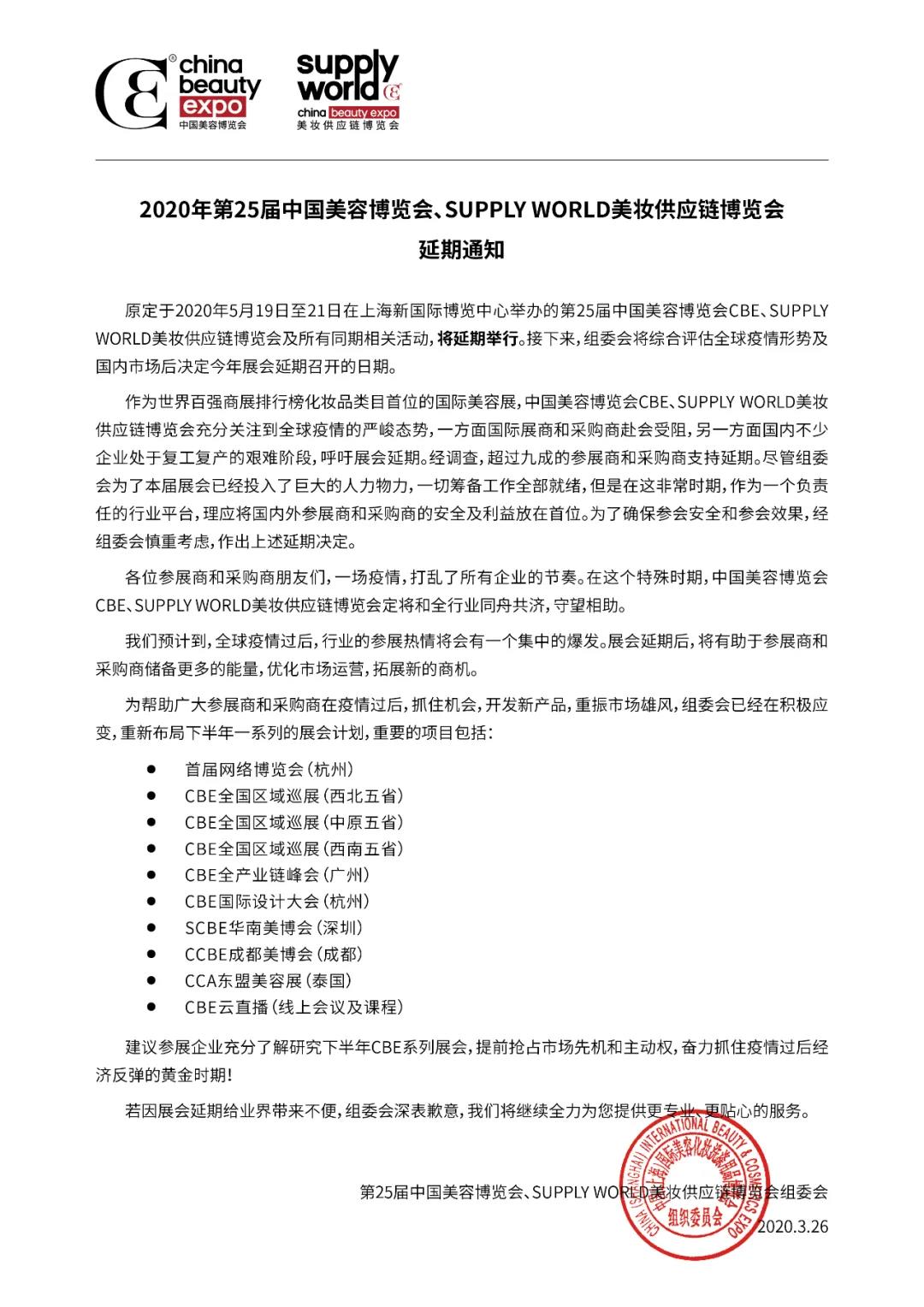 根據美博會設計搭建公司領藝展覽了解到,原定于2020年5月19日至21日在上海新國際博覽中心舉辦的第25屆中國美容博覽會CBE、SUPPLY WORLD美妝供應鏈博覽會及所有同期相關活動,將延期舉行。接下來,組委會將綜合評估全球疫情形勢及國內市場后決定今年展會延期召開的日期。如需美博會設計請聯系領藝展覽,希望我們能在美博會搭建上為您添磚加瓦,祝各位朋友收獲多多,滿載而歸!