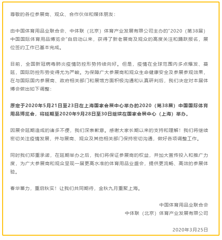 根據(jù)體博會設(shè)計搭建公司領(lǐng)藝展覽了解到,原定于2020年5月21日至23日在上海國家會展中心舉辦的2020(第38屆)中國國際體育用品博覽會,將延期至2020年9月28日至30日繼續(xù)在國家會展中心(上海)舉辦。如需體博會設(shè)計請聯(lián)系領(lǐng)藝展覽,希望我們能在體博會搭建上為您添磚加瓦,祝各位朋友收獲多多,滿載而歸!