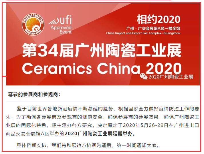 根據(jù)陶瓷展設(shè)計搭建公司領(lǐng)藝展覽了解到,原定于2020年5月26-29日在廣州進(jìn)出口商品交易會展館A區(qū)舉辦的2020廣州陶瓷工業(yè)展延期舉辦。如需陶瓷展設(shè)計請聯(lián)系領(lǐng)藝展覽,希望我們能在陶瓷展搭建上為您添磚加瓦,祝各位朋友收獲多多,滿載而歸!