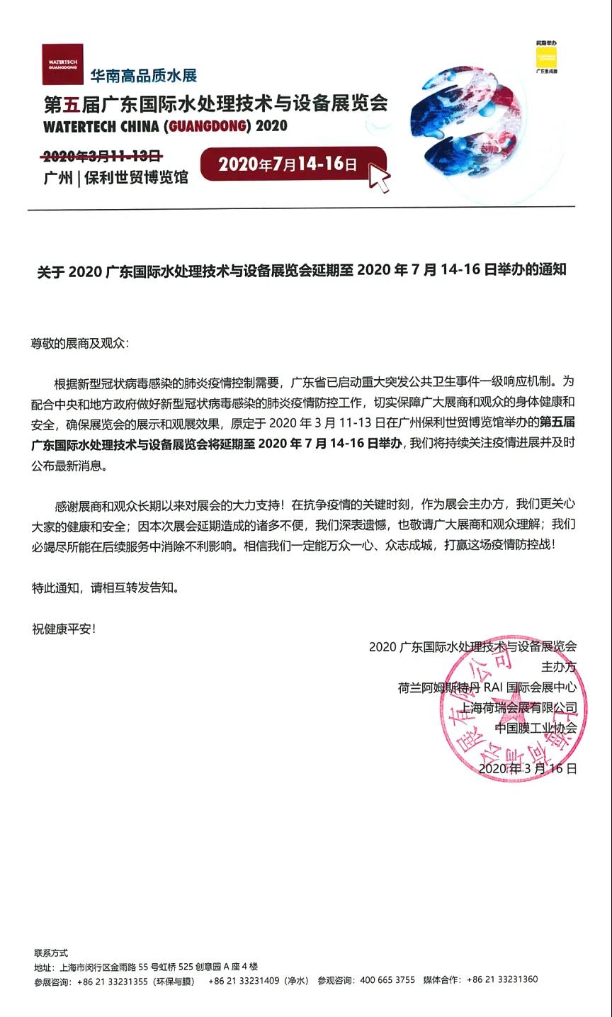 根據(jù)國(guó)際水展設(shè)計(jì)搭建公司領(lǐng)藝展覽了解到,受新冠肺炎疫情影響,原定于2020年3月11-13日在廣州保利世貿(mào)博覽館舉辦的2020廣東國(guó)際水處理技術(shù)與設(shè)備展覽會(huì)將延期至2020年7月14-16日舉辦。。如需國(guó)際水展設(shè)計(jì)請(qǐng)聯(lián)系領(lǐng)藝展覽,希望我們能在國(guó)際水展搭建上為您添磚加瓦,祝各位朋友收獲多多,滿載而歸!