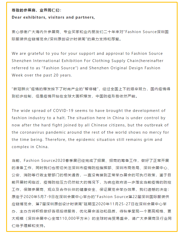 根據(jù)服裝展設(shè)計(jì)搭建公司領(lǐng)藝展覽了解到,原定于2020年5月7-9日在深圳會(huì)展中心舉辦的“Fashion Source第22屆深圳國際服裝供應(yīng)鏈博覽會(huì)、第7屆深圳原創(chuàng)設(shè)計(jì)時(shí)裝周“延期至2020年11月25-27日在深圳會(huì)展中心舉辦,主辦方將積極做好各項(xiàng)后續(xù)服務(wù),優(yōu)化展會(huì)活動(dòng)和品質(zhì),待秋季呈現(xiàn)一個(gè)更高規(guī)格、更大規(guī)模(深圳會(huì)展中心全館110,000平方米)的全球時(shí)尚貿(mào)易盛會(huì),請廣大參展商及行業(yè)同仁給予理解和支持。如需服裝展設(shè)計(jì)請聯(lián)系領(lǐng)藝展覽,希望我們能在服裝展搭建上為您添磚加瓦,祝各位朋友收獲多多,滿載而歸!