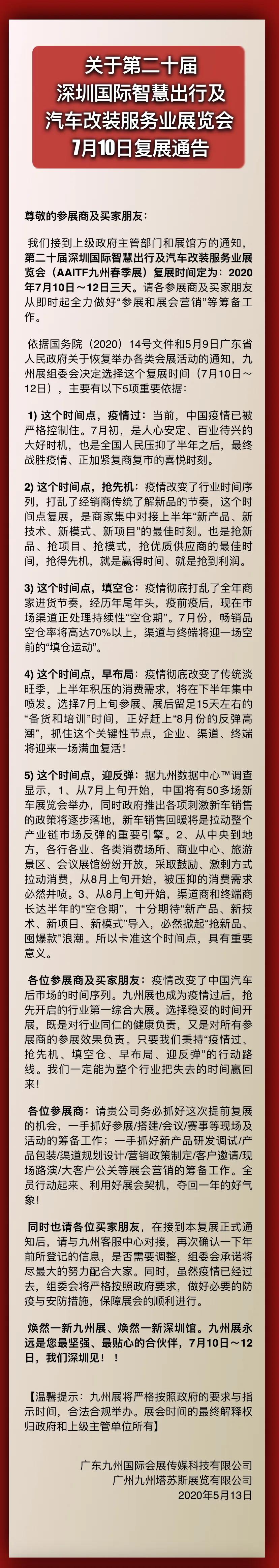 九州汽配展設計搭建公司領藝展覽了解到,AAITF,英文全稱為“Automotive Aftermarket Industry and Tuning Trade Fair ”,中文全稱為“汽車改裝服務業(yè)展覽會”將于2020年7月10-12日,在深圳國際會展中心(寶安)舉辦。如需展會設計請聯(lián)系領藝展覽,希望我們能在九州展搭建上為您添磚加瓦,祝各位朋友收獲多多,滿載而歸!