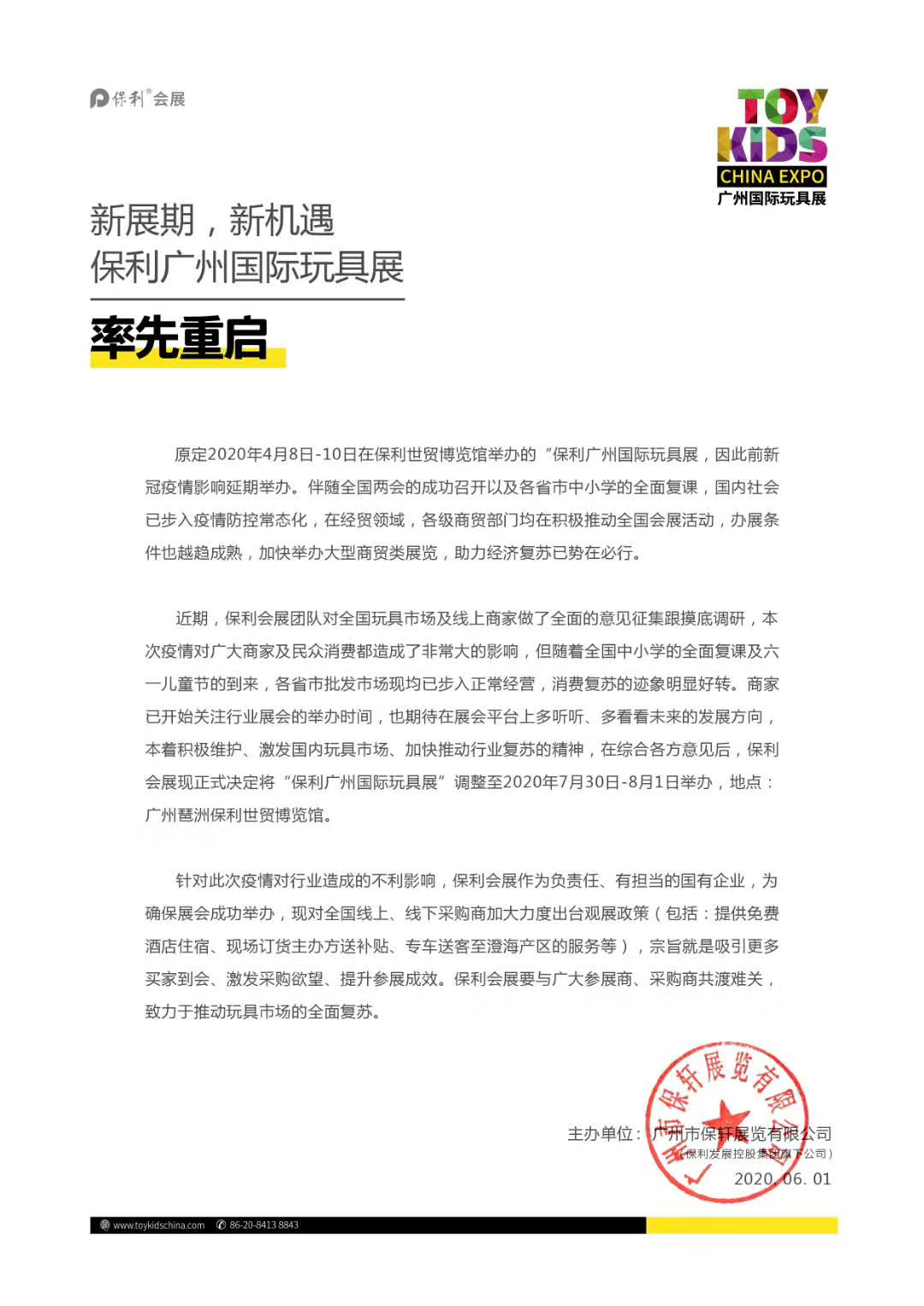 廣州玩具展設(shè)計(jì)搭建公司領(lǐng)藝展覽了解到,原定于2020年4月8日舉行的“保利廣州國(guó)際玩具展”調(diào)整至2020年7月30日-8月1日舉行。如需廣州玩具展設(shè)計(jì)請(qǐng)聯(lián)系領(lǐng)藝展覽,希望我們能在廣州玩具展搭建上為您添磚加瓦,祝各位朋友收獲多多,滿載而歸!
