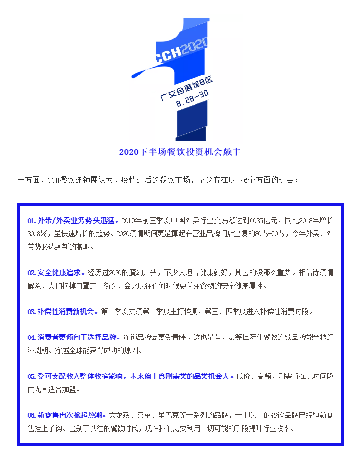 從6月底開(kāi)始,上海、北京等地的各類展會(huì),將陸續(xù)分期召開(kāi)。而定檔于8月28-30日的CCH國(guó)際餐飲連鎖加盟展覽會(huì)(以下簡(jiǎn)稱:CCH餐飲連鎖展),也將在廣交會(huì)展館B區(qū)隆重揭幕。