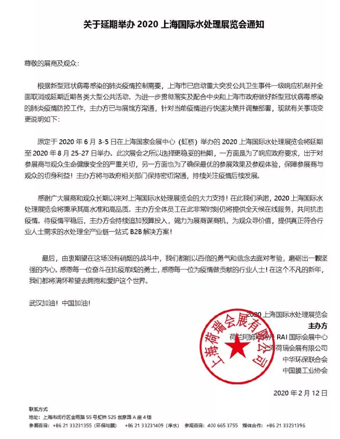 為全力支持打贏疫情防控阻擊戰(zhàn),貫徹落實(shí)上海市疫情防控工作領(lǐng)導(dǎo)小組的防疫工作指導(dǎo)方針,切實(shí)保障廣大展商和觀眾的身體健康和安全,確保展覽會的展示和觀展效果,原定于2020年6月3-5日在上海國家會展中心(虹橋)舉辦的2020上海國際水處理展覽會將延期至2020年8月25-27日舉辦。我們將繼續(xù)密切關(guān)注展會動態(tài),希望我們能在上海水展搭建上為您添磚加瓦。!上海水展設(shè)計搭建公司領(lǐng)藝展覽在此非常時刻仍將提供全天候在線服務(wù),共同抗擊疫情。預(yù)祝各位朋友收獲多多,滿載而歸!