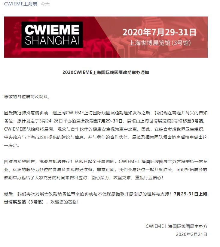 根據(jù)上海線圈展設(shè)計(jì)搭建公司領(lǐng)藝展覽了解到,因受新冠肺炎疫情影響,繼上周CWIEME上海國(guó)際線圈展延期通知發(fā)布之后,原計(jì)劃定于3月24-26日舉辦的展會(huì)改期至7月29-31日。如需線圈展設(shè)計(jì)請(qǐng)聯(lián)系領(lǐng)藝展覽,希望我們能在線圈展搭建上為您添磚加瓦,祝各位朋友收獲多多,滿載而歸!