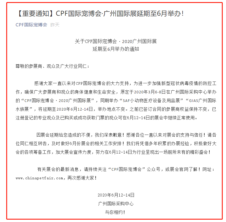 根據(jù)CPF寵博會(huì)設(shè)計(jì)搭建公司領(lǐng)藝展覽了解到,為進(jìn)一步加強(qiáng)新型冠狀病毒疫情的防控工作,確保廣大參展商和觀眾的身體健康和生命安全,原定于2020年3月6-8日在廣州國際采購中心舉辦的“CPF國際寵博會(huì)·2020廣州國際展”,同期舉辦“SAF小動(dòng)物醫(yī)療設(shè)備及用品展”“GIAS廣州國際水族展”,將延期至2020年6月12-14日,舉辦地點(diǎn)不變。如需廣州寵博會(huì)設(shè)計(jì)請聯(lián)系領(lǐng)藝展覽,希望我們能在寵物展搭建上為您添磚加瓦,祝各位朋友收獲多多,滿載而歸!