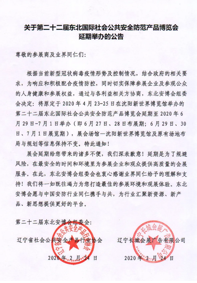 根據(jù)安博會設(shè)計搭建公司領(lǐng)藝展覽了解到,根據(jù)當(dāng)前新型冠狀病毒疫情形勢及控制情況,結(jié)合政府的相關(guān)要求,為響應(yīng)和積極配合疫情防控,同時切實保障參展企業(yè)及參觀公眾的人身健康和參展權(quán)益,通過與各利益相關(guān)方協(xié)商,東北安博會組委會決定:將原定于2020年4月23-25日在沈陽新世界博覽館舉辦的第二十二屆東北國際社會公共安全防范產(chǎn)品博覽會延期至2020年6月29日-7月1日舉辦(即6月27日、28日布展期;6月29日、30日、7月1日展覽期),展會場館—沈陽新世界博覽館及原有場地布局與規(guī)劃等信息保持不變。特此通知!