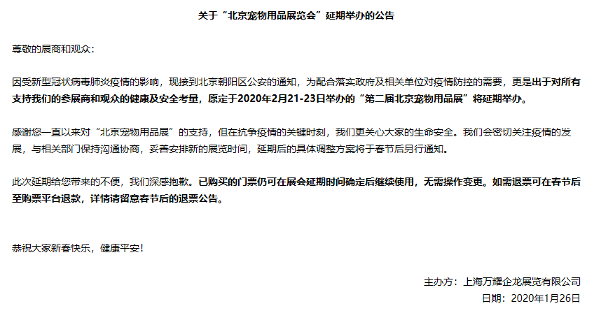 根據(jù)北京寵物展設(shè)計(jì)搭建公司領(lǐng)藝展覽了解到,因受新型冠狀病毒肺炎疫情的影響,主辦方為配合落實(shí)政府及相關(guān)單位對(duì)疫情防控的需要,更是出于對(duì)所有支持我們的參展商和觀眾的健康及安全考量,原定于2020年2月21-23日舉辦的“第二屆北京寵物用品展”將延期舉辦。如需北京寵物展設(shè)計(jì)請(qǐng)聯(lián)系領(lǐng)藝展覽,希望我們能在北京寵物展搭建上為您添磚加瓦,祝各位朋友收獲多多,滿載而歸!