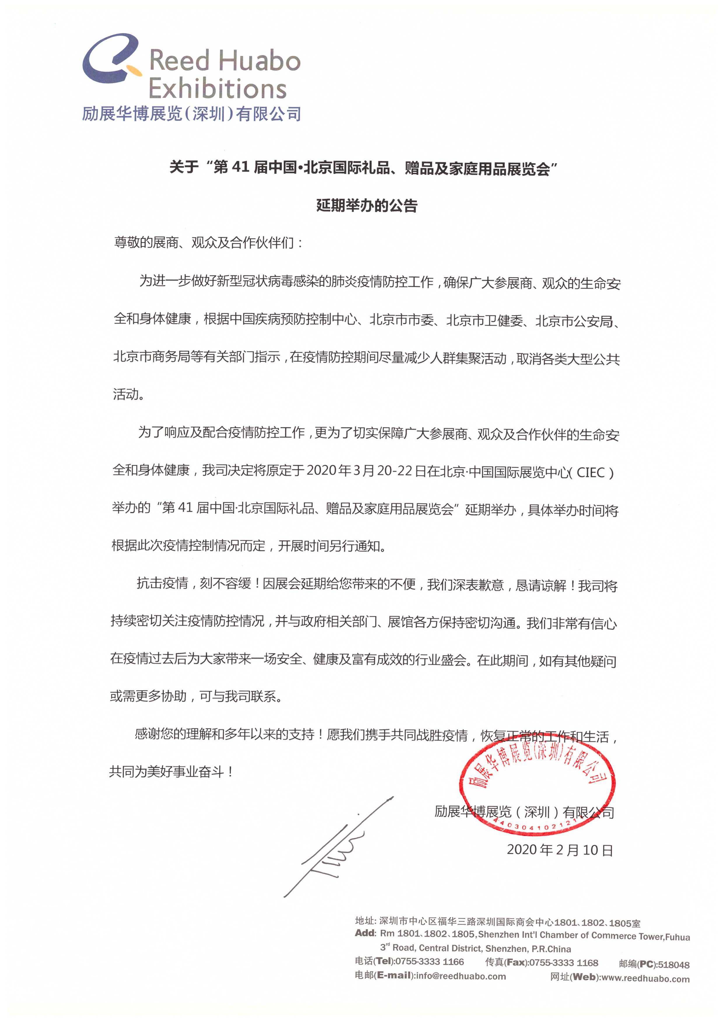 為進(jìn)一步做好新型冠狀病毒感染的肺炎疫情防控工作,確保廣大參展商、觀眾的生命安全和身體健康,根據(jù)中國疾病預(yù)防控制中心、北京市市委、北京市衛(wèi)委、北京市公安局、北京市商務(wù)局等有關(guān)部門指示,在疫情防控期間盡量減少人群集聚活動(dòng),取消各類大型公共活動(dòng)。