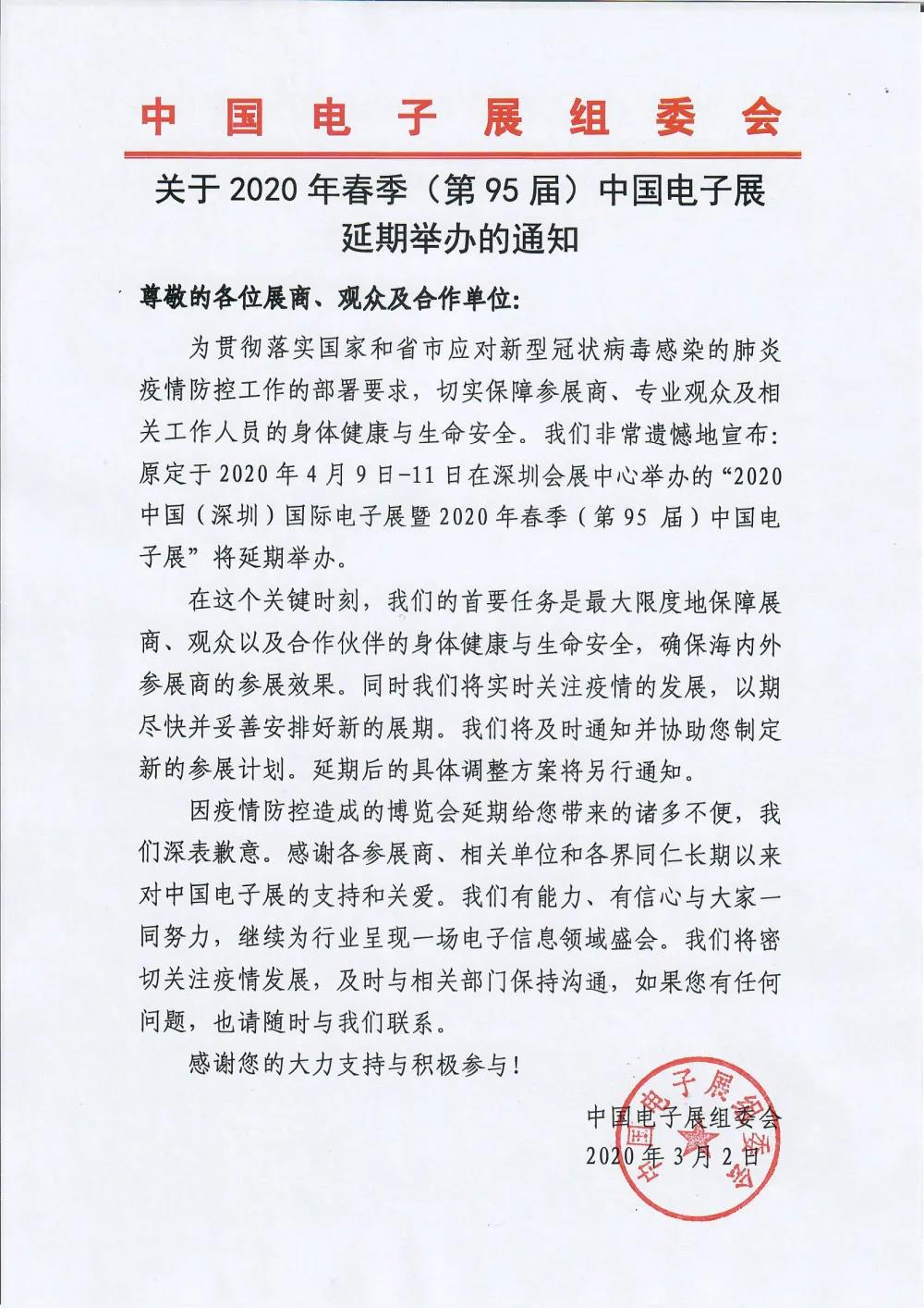 根據(jù)深圳電子展設(shè)計(jì)搭建公司領(lǐng)藝展覽了解到,原定于2020年4月9-11日在深圳會(huì)展中心舉辦的第95屆中國(guó)電子展延期,延期后的具體調(diào)整方案將另行通知。如需深圳電子展設(shè)計(jì)請(qǐng)聯(lián)系領(lǐng)藝展覽,希望我們能在深圳電子展搭建上為您添磚加瓦,祝各位朋友收獲多多,滿載而歸!