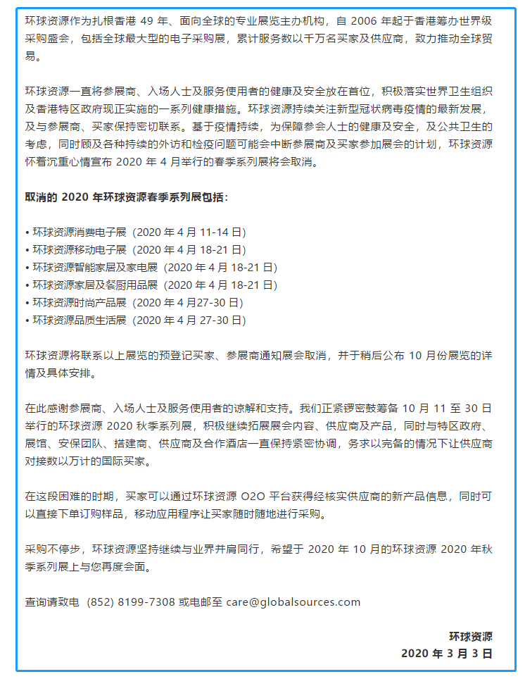 根據(jù)電子展設計搭建公司領藝展覽了解到,環(huán)球資源作為扎根香港 49 年、面向全球的專業(yè)展覽主辦機構,自 2006 年起于香港籌辦世界級采購盛會,包括全球最大型的電子采購展,累計服務數(shù)以千萬名買家及供應商,致力推動全球貿易。基于疫情持續(xù),為保障參會人士的健康及安全,及公共衛(wèi)生的考慮,同時顧及各種持續(xù)的外訪和檢疫問題可能會中斷參展商及買家參加展會的計劃,環(huán)球資源懷著沉重心情宣布 2020 年 4 月舉行的春季系列展將會取消。原計劃環(huán)球資源消費電子展展會時間是2020 年 4 月 11-14 日。環(huán)球資源將聯(lián)系展覽的預登記買家、參展商通知展會取消,并于稍后公布 10 月份展覽的詳情及具體安排。如需電子展展臺設計請聯(lián)系領藝展覽,希望我們能在電子展展臺搭建上為您添磚加瓦,祝各位朋友收獲多多,滿載而歸!
