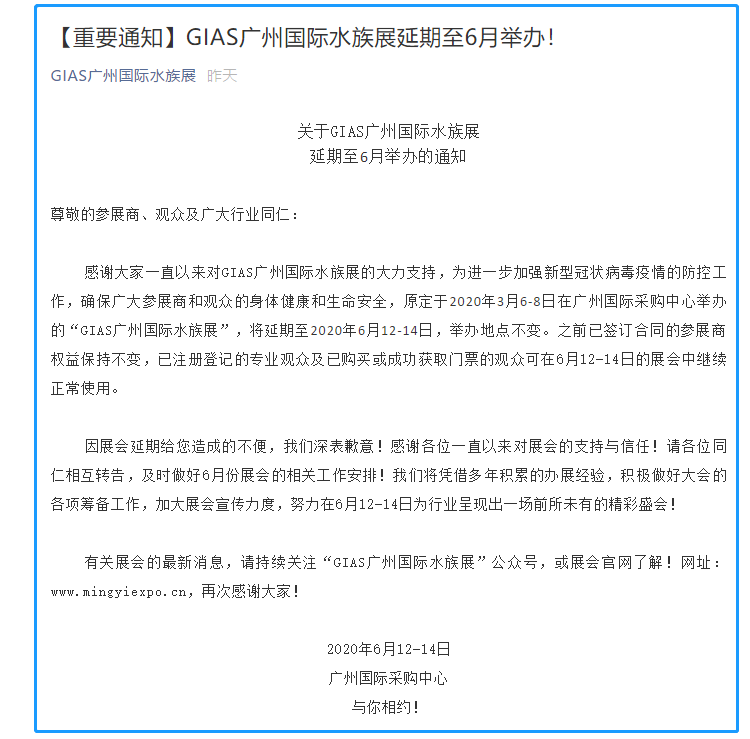 根據(jù)廣州水族展設(shè)計搭建公司領(lǐng)藝展覽了解到,為進一步加強新型冠狀病毒疫情的防控工作,確保廣大參展商和觀眾的身體健康和生命安全,原定于2020年3月6-8日在廣州國際采購中心舉辦的“GIAS廣州國際水族展”,將延期至2020年6月12-14日,舉辦地點不變。如需廣州水族展設(shè)計請聯(lián)系領(lǐng)藝展覽,希望我們能廣州水族展搭建上為您添磚加瓦,祝各位朋友收獲多多,滿載而歸!