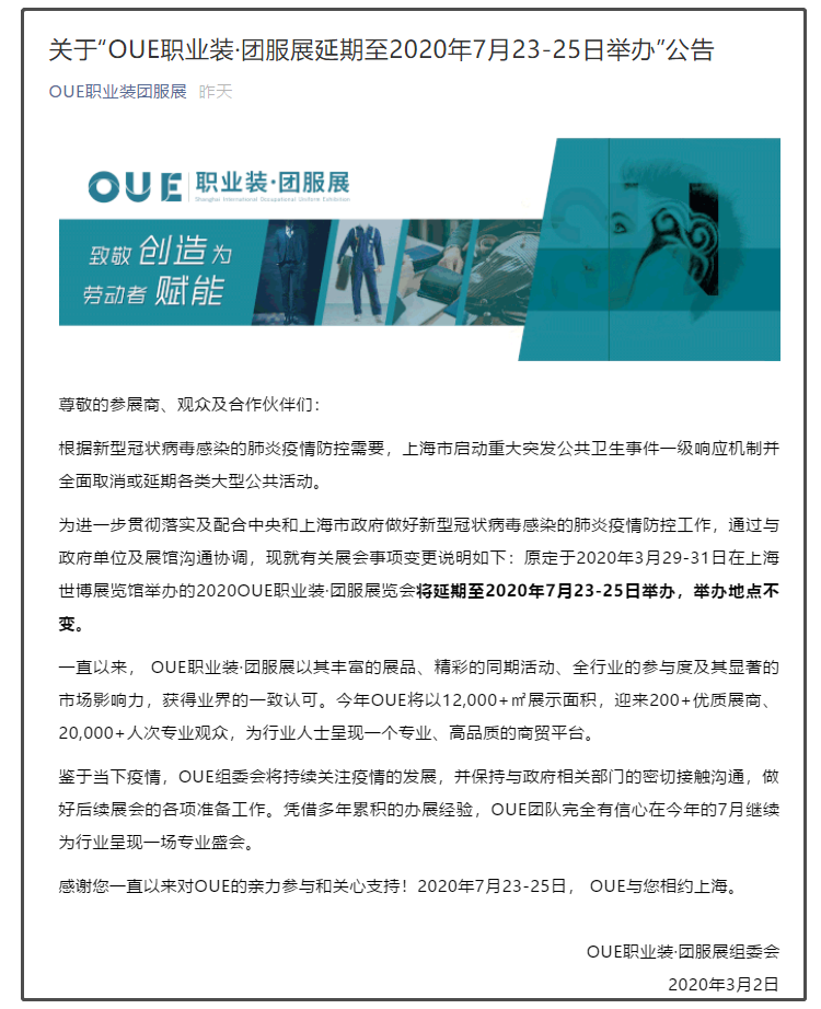 根據(jù)上海服裝展設(shè)計搭建公司領(lǐng)藝展覽了解到,為進一步貫徹落實及配合中央和上海市政府做好新型冠狀病毒感染的肺炎疫情防控工作,通過與政府單位及展館溝通協(xié)調(diào),現(xiàn)就有關(guān)展會事項變更說明如下:原定于2020年3月29-31日在上海世博展覽館舉辦的2020OUE職業(yè)裝·團服展覽會將延期至2020年7月23-25日舉辦,舉辦地點不變。如需上海服裝展設(shè)計請聯(lián)系領(lǐng)藝展覽,希望我們能在上海展臺搭建上為您添磚加瓦,祝各位朋友收獲多多,滿載而歸!