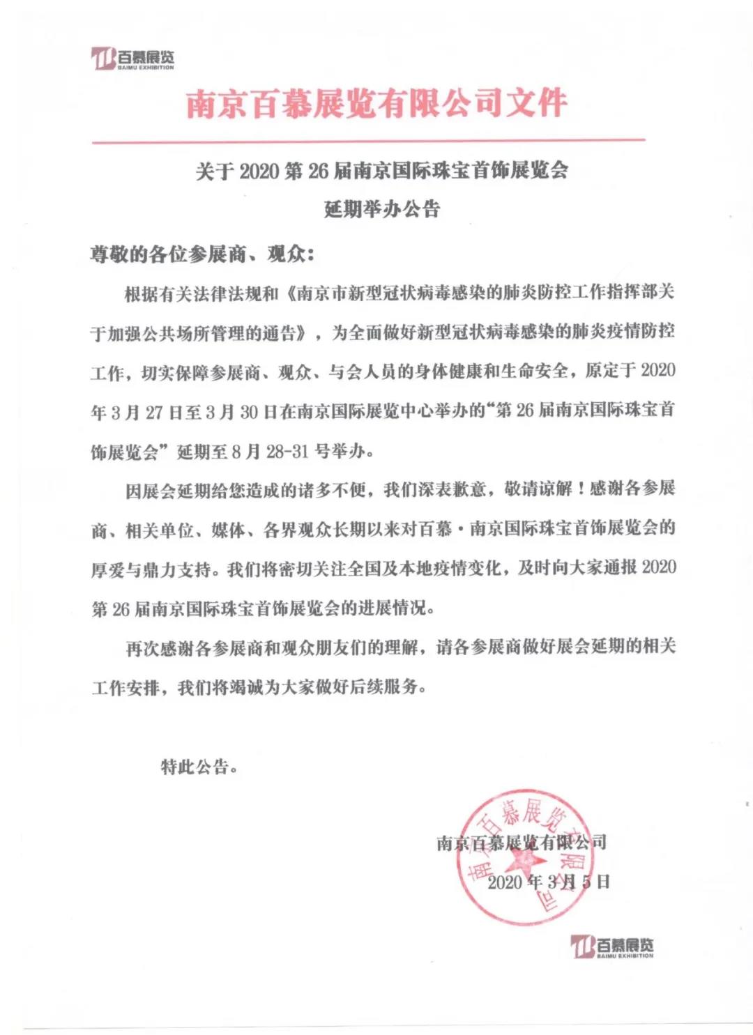 根據(jù)珠寶展設(shè)計搭建公司領(lǐng)藝展覽了解到,原定于2020年3月27-30日在南京國際展覽中心舉辦的第26屆南京國際珠寶首飾展覽會延期至8月28日-31日舉辦。如需珠寶展展臺設(shè)計請聯(lián)系領(lǐng)藝展覽,希望我們能在珠寶展展臺搭建上為您添磚加瓦,祝各位朋友收獲多多,滿載而歸!