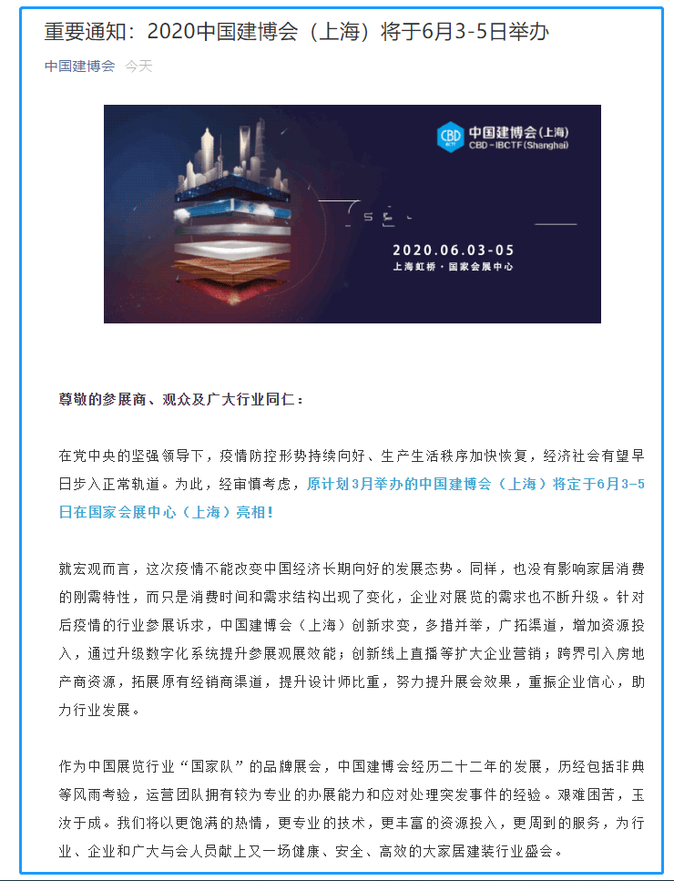 根據(jù)上海建博會設計搭建公司領(lǐng)藝展覽了解到,原計劃3月舉辦的中國建博會(上海)將定于6月3-5日在國家會展中心(上海)亮相!全力為行業(yè)奉獻一場保障安全、富有成效、占得先機的采購貿(mào)易盛會!如需上海建博會設計請聯(lián)系領(lǐng)藝展覽,希望我們能在上海建博會搭建上為您添磚加瓦,祝各位朋友收獲多多,滿載而歸!
