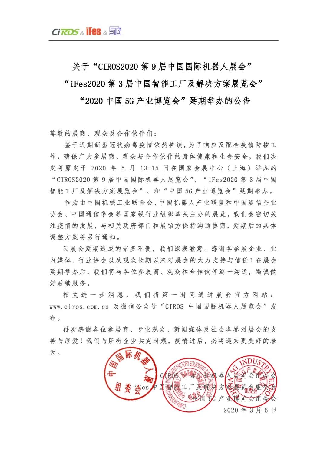 根據上海展臺設計搭建公司領藝展覽了解到原定于2020年5月13-15日在國家會展中心(上海)舉辦的“CIROS2020第9屆中國國際機器人展覽會”、“iFes2020第3屆中國智能工廠及解決方案展覽會”和“中國5G產業(yè)博覽會”延期舉辦。如需上海展臺設計請聯系領藝展覽,希望我們能在上海展臺搭建上為您添磚加瓦,祝各位朋友收獲多多,滿載而歸!