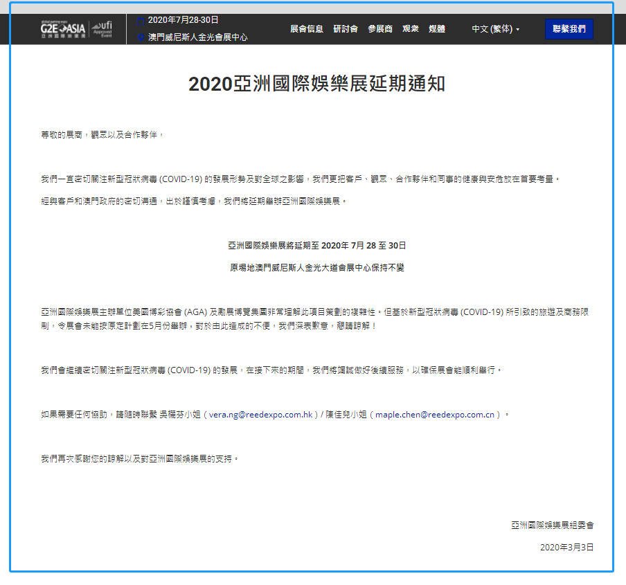 根據(jù)娛樂(lè)展設(shè)計(jì)搭建公司領(lǐng)藝展覽了解到,受新冠肺炎疫情的影響。亞洲國(guó)際娛樂(lè)展將延期至 2020年 7月 28 至 30日,原場(chǎng)地澳門(mén)威尼斯人金光大道會(huì)展中心保持不變。如需娛樂(lè)展設(shè)計(jì)請(qǐng)聯(lián)系領(lǐng)藝展覽,希望我們能在澳門(mén)展臺(tái)展搭建上為您添磚加瓦,祝各位朋友收獲多多,滿(mǎn)載而歸!