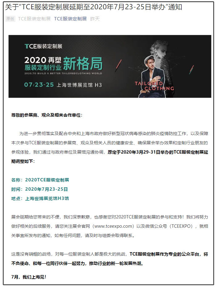 根據(jù)上海展臺(tái)設(shè)計(jì)搭建公司領(lǐng)藝展覽了解到,原定于2020年3月29-31日舉辦的TCE服裝定制展延期至2020年7月23-25日。一場(chǎng)高效鏈接產(chǎn)業(yè)資源、助推企業(yè)經(jīng)濟(jì)發(fā)展的行業(yè)盛會(huì)即將再度呈現(xiàn)!盛夏七月,不見(jiàn)不散!如需服裝定制展展臺(tái)設(shè)計(jì)請(qǐng)聯(lián)系領(lǐng)藝展覽,希望我們能在服裝定制展展臺(tái)搭建上為您添磚加瓦,祝各位朋友收獲多多,滿載而歸!