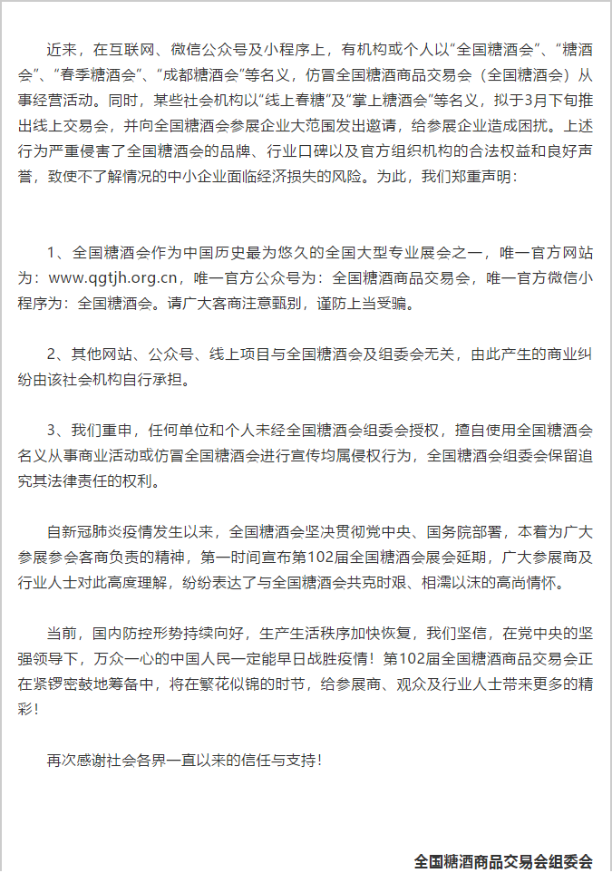 根據(jù)糖酒會設(shè)計搭建公司領(lǐng)藝展覽從糖酒會組委會官網(wǎng)了解到,近來,在互聯(lián)網(wǎng)、微信公眾號及小程序上,有機構(gòu)或個人以“全國糖酒會”、“糖酒會”、“春季糖酒會”、“成都糖酒會”等名義,仿冒全國糖酒商品交易會(全國糖酒會)從事經(jīng)營活動。同時,某些社會機構(gòu)以“線上春糖”及“掌上糖酒會”等名義,擬于3月下旬推出線上交易會,并向全國糖酒會參展企業(yè)大范圍發(fā)出邀請,給參展企業(yè)造成困擾。上述行為嚴(yán)重侵害了全國糖酒會的品牌、行業(yè)口碑以及官方組織機構(gòu)的合法權(quán)益和良好聲譽,致使不了解情況的中小企業(yè)面臨經(jīng)濟損失的風(fēng)險。