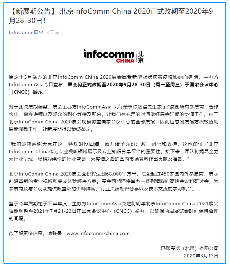 根據(jù)北京展會設計搭建公司領藝展覽了解到,原定于3月舉辦的北京InfoComm China 2020展會因受新型冠狀病毒疫情影響而延期。主辦方InfoCommAsia今日宣布,展會將正式改期至2020年9月28-30日(周一至周三)于國家會議中心(CNCC)舉辦。如需北京展會設計請聯(lián)系領藝展覽,希望我們能在北京展會搭建上為您添磚加瓦,祝各位朋友收獲多多,滿載而歸!