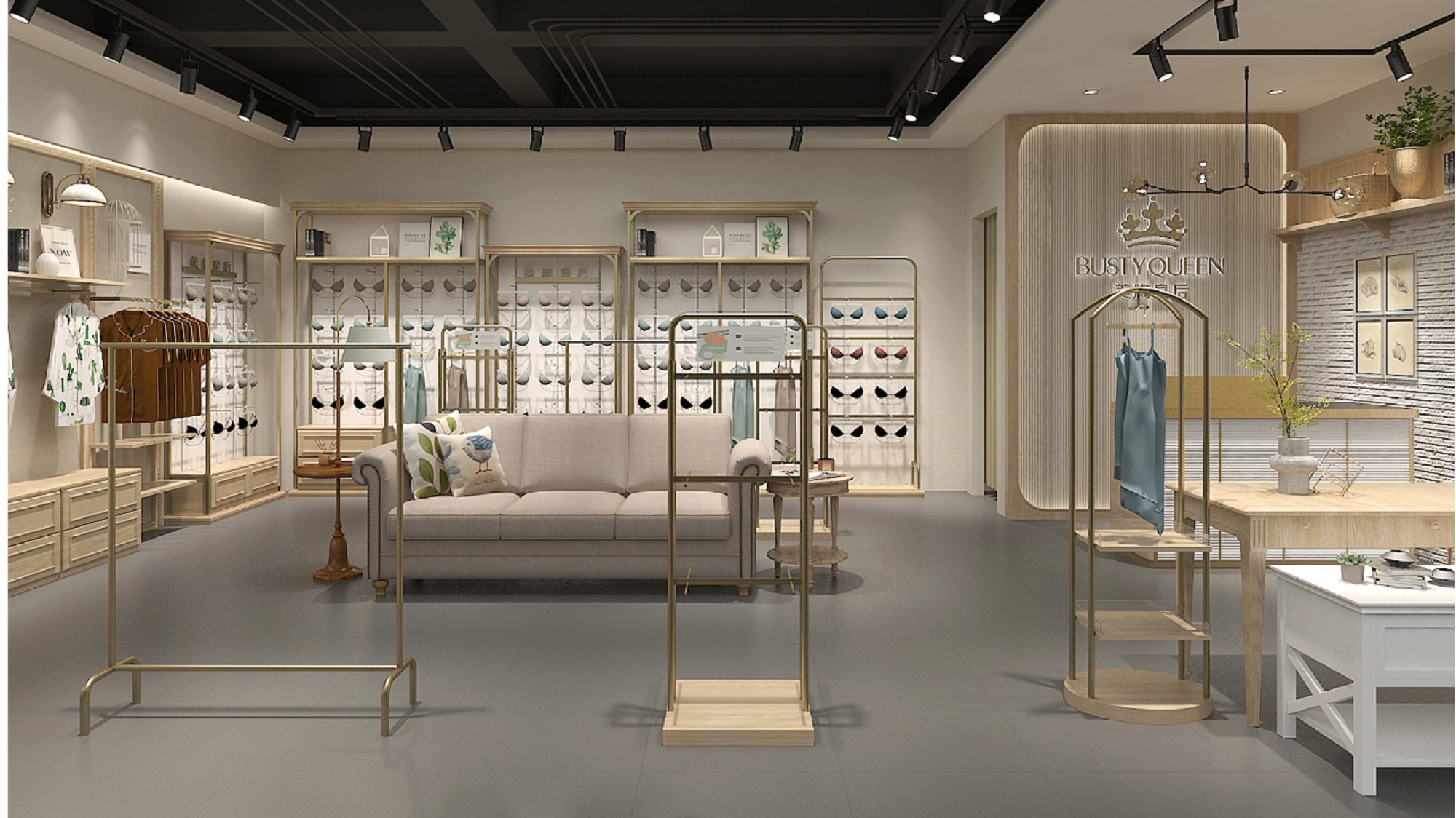 契合美胸皇后的品牌形象和產(chǎn)品特性,采用開放式結構進行合理的分區(qū),再搭配燈具燈光的效果,襯托出專賣店大氣、豪華的氛圍,突出一種簡約、時尚的品味。
