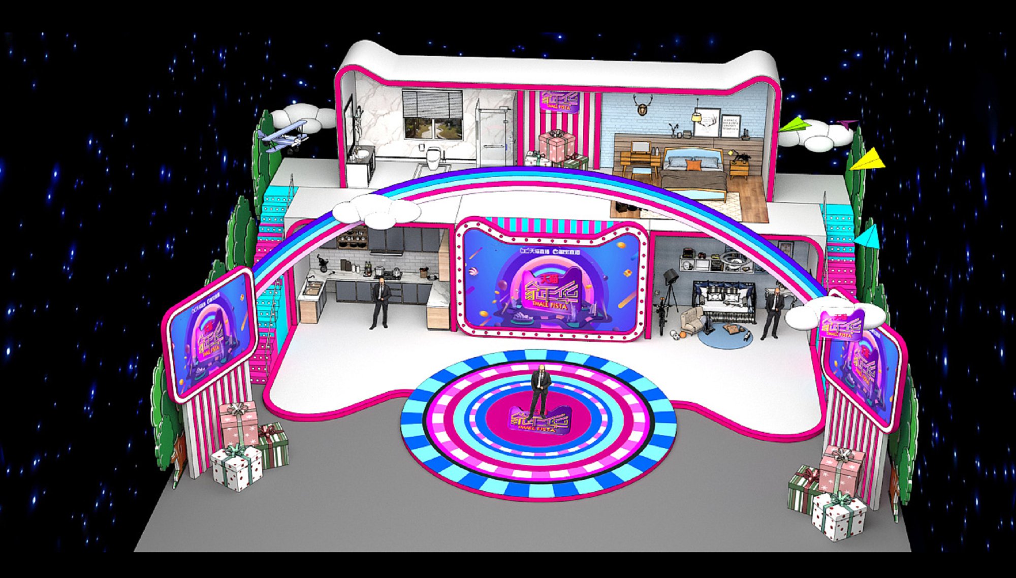 契合天貓的品牌形象和產(chǎn)品特性,采用開(kāi)放式結(jié)構(gòu),再搭配燈具燈光的效果,襯托出直播間大氣、豪華的氛圍,突出一種簡(jiǎn)約、時(shí)尚的品味。